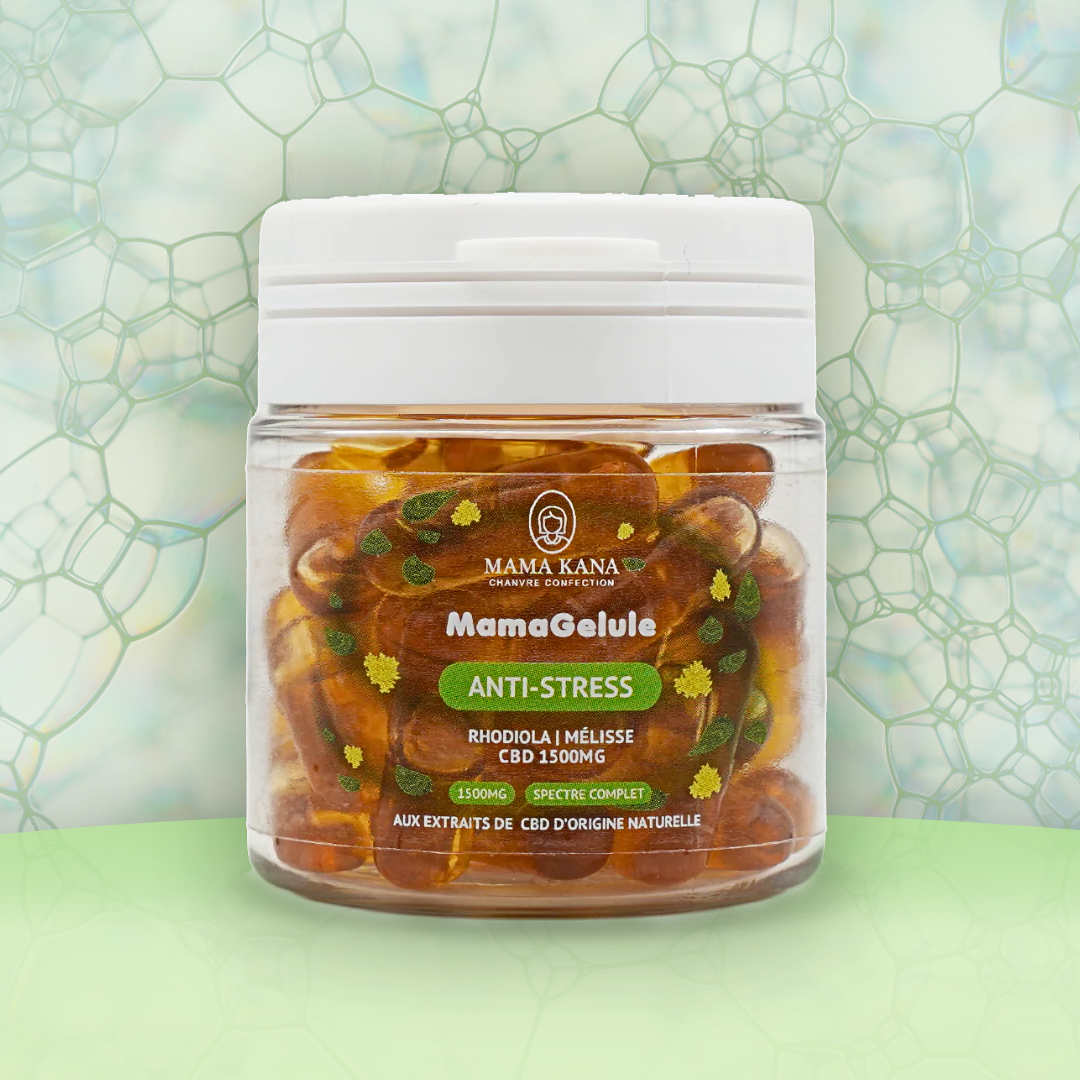 Descoperiți seninătatea de zi cu zi cu Anti-Stress Mamagélules. Formulate pentru a vă ajuta să gestionați stresul și să promovați relaxarea, aceste capsule combină beneficiile CBD Full Spectrum cu extracte de plante calmante.
